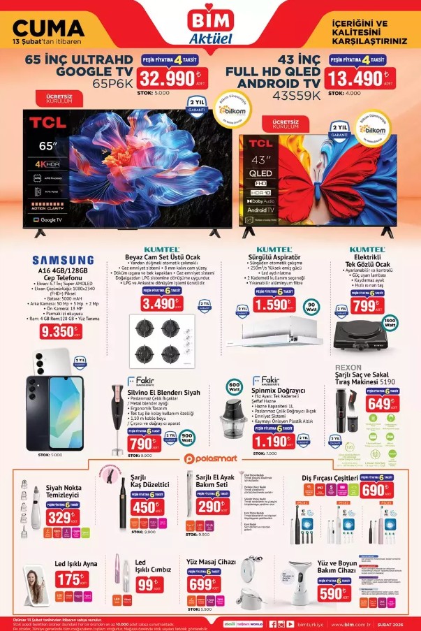BİM bu hafta, 32.990 TL’lik TCL Google TV’den 9.350 TL’lik Samsung A16 cep telefonuna, temel gıda ürünlerindeki büyük indirimlerden Sevgililer Günü özel hediyeliklerine kadar geniş bir yelpaze sunuyor.